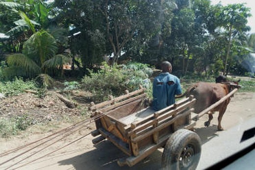Als erstes weist er uns auf der Landstraße auf die "Kuhtaxis" hin. Da wir mit dem Begriff nichts anfangen können, erklärt er, dass man darunter einen einachsigen Karren versteht, der von einem Rind gezogen wird. Man kann sie für den Personen- oder Frachttransport mieten.