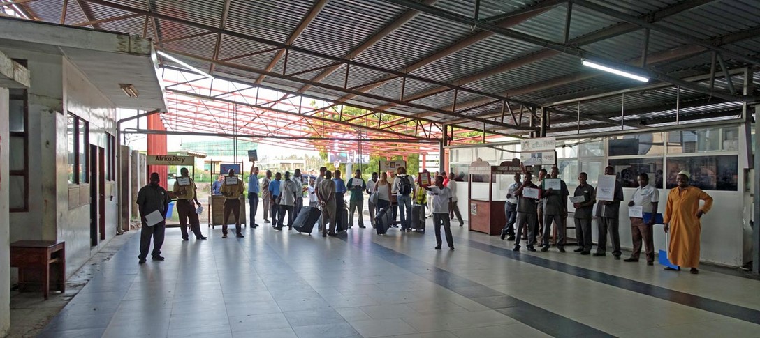Hier ist es jetzt 6:20 Uhr Ortszeit, also eine Stunde später als bei uns zu Hause. Die Besatzung wechselt für einen Weiterflug nach Mombasa. Alle Passagiere, die dorthin weiterfliegen, sollen im Flugzeug sitzen bleiben. Wir steigen aus und hören noch die Durchsage, dass die Regierung eine Anti-Korruptions-kampagne macht und darauf hinweist, dass die Benutzung der Toiletten und die Gepäckwächter kostenlos sind.