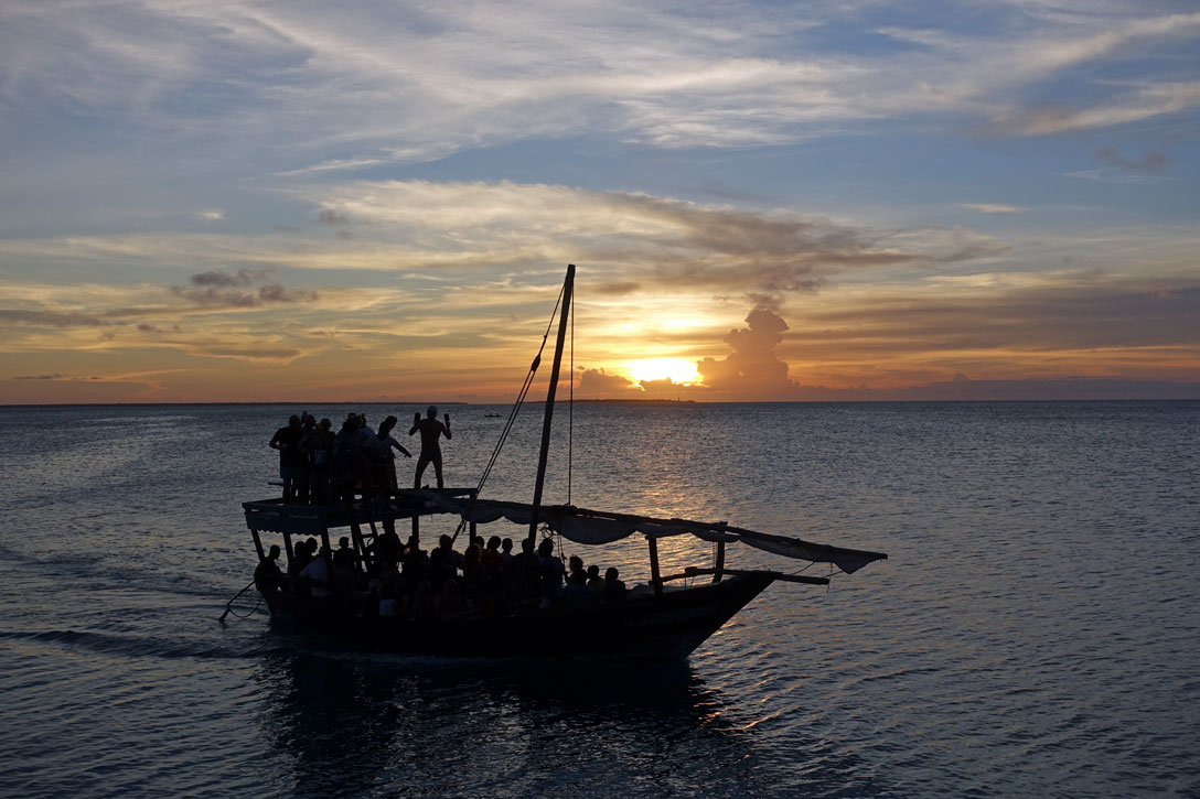 Letzter Tag im afrikanischen Paradies. Nach einem heißen Tag gibt es zur Happy Hour keinen schönen Sonnenuntergang mehr, sondern nur noch lärmende Touristen auf den vorbeifahrenden Dhaus. Wir verabschieden uns von der Kellnerin Florence mit 5 $ Extratrinkgeld und sie ist happy.