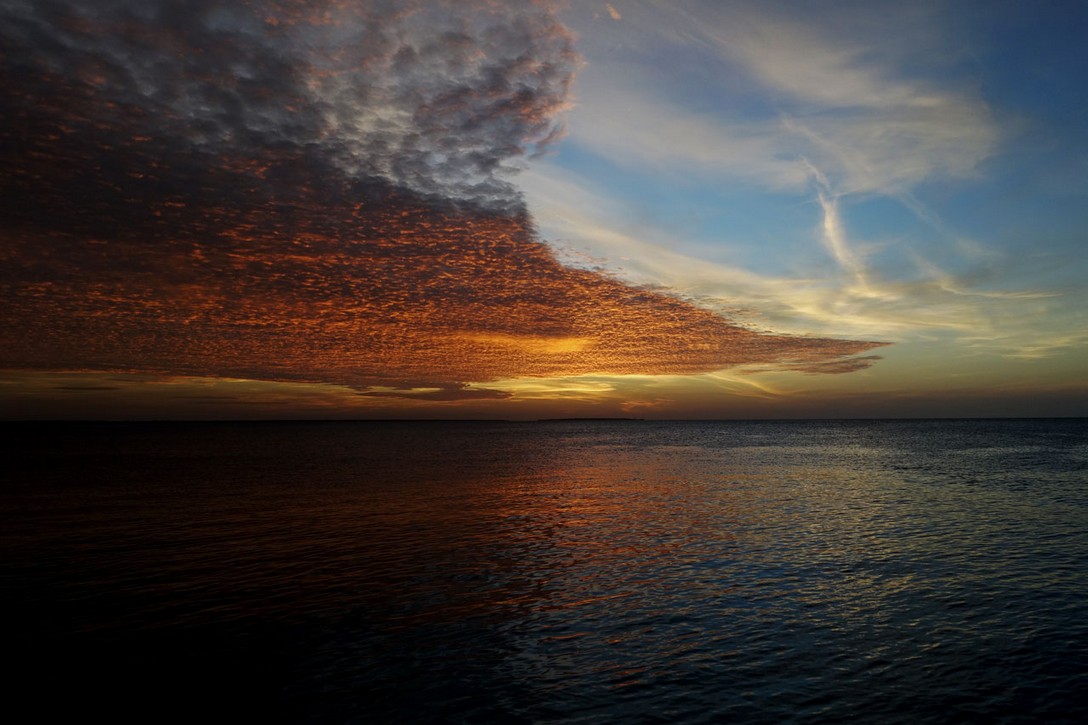 Am Nachmittag lässt der Wind nach und und die Sonne scheint nicht mehr so stark durch die Schleierwolken. Das gefällt uns sehr, denn man muss sich erst einmal an die Sonne gewöhnen. Zum Sonnenuntergang setzen wir uns in die Sunsetbar und beobachten die Fischschwärme. Es sind nur wenige Gäste hier, die sich den spektakulären Sonnenuntergang anschauen:
