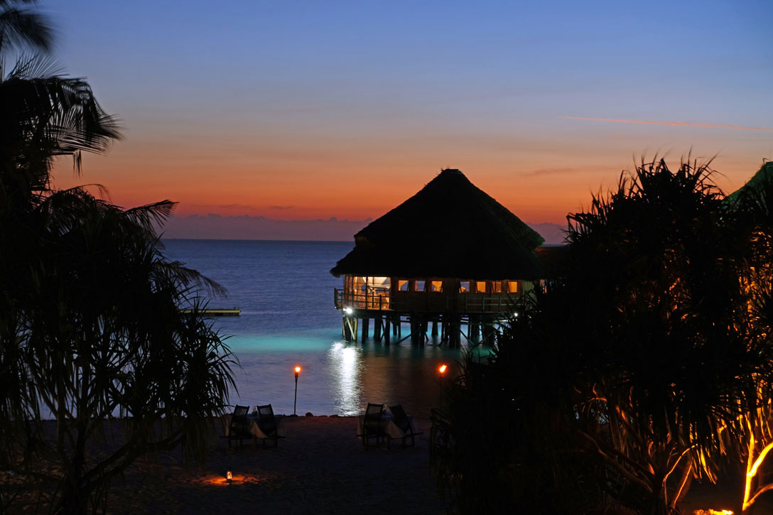 Zum Sonnenuntergang machen wir eine Happy Hour an der Sunsetbar mit einem Mojito und einer Passionfruit-Colada. Die Drinks sind hervorragend. Das Abendessen wird in Büffetform im Restaurant serviert. Dazu spielt eine Band afrikanische Rhythmen. Als wir in unser Zimmer zurückkommen, hat unser Zimmermädchen Twiwalu den Moskitovorhang um das Bett gelegt und alles malerisch drapiert. Es ist ohne Klimaanlage sehr angenehm und wir schlafen darunter wunderbar.