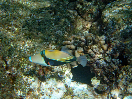 Geärgert hat mich immer, dass ich den Staatsfisch von Hawaii, den Humuhumunukunukuapua`a niemals so richtig vor die Camera bekommen habe. Dieser Triggerfish (auf deutsch: Drückerfisch) sieht so schön bunt aus, dreht sich aber immer weg, weg, wenn ich fotografieren will:
