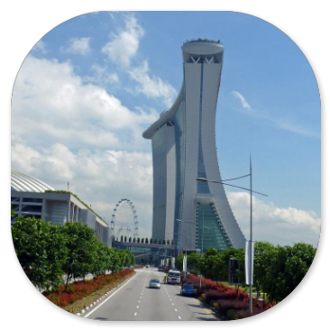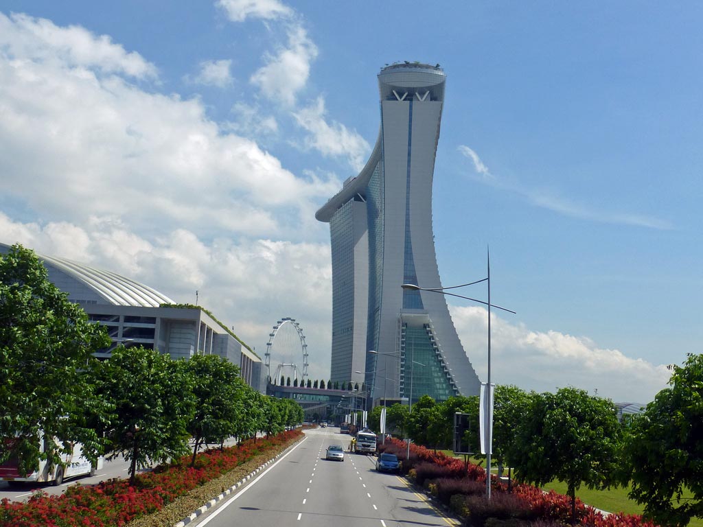 So haben wir vom 22. Stock einen schönen Blick auf die Marina Bay und sind total erstaunt, was sich hier alles verändert hat, seit wir vor acht Jahren hier waren. Das Ritz Carlton, in dem wir damals wohnten, liegt links neben uns und das Mandarin Oriental davor. Aber die Marina Bay sieht ganz anders aus. Überragt wird alles von dem "Flyer", dem 165 m hohen Riesenrad , das wir auf der linken Seite sehen, wenn wir aus dem Fenster schauen. Darunter verläuft die neue Autobahn und auch die Formel-1-Rennstrecke.