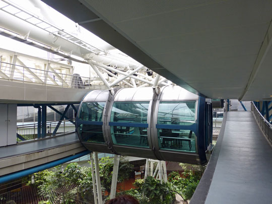Die Gondeln bewegen sich ganz langsam und bleiben nicht stehen, sondern man muss in eine fahrende Gondel einsteigen. Das geht aber problemlos. Glücklichweise ist nicht so viel Betrieb und die Gondeln sind meist leer. Hinter uns kommt ein japanischer Reisebus und wir sind froh, mit zwei Franzosen und drei Japanerinnen in der Gondel zu verschwinden, bevor uns die ersten fernöstlichen Greise erreichen. Die Fahrt mit dem Flyer ist schon ein tolles Erlebnis. Eine Umdrehung dauert etwa 40 Minuten und wir fühlen uns in der klimatisierten Gondel recht wohl. Ganz langsam steigen wir hoch und staunen über den 45 km weiten Blick, den man von oben über Singapur und das Meer hat.