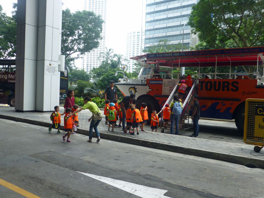 Vor der Haltestelle warten natürlich auch viele Schulkinder, die einen Ausflug machen. Selbst die Kleinsten haben Spaß an einer Fahrt mit dem Amphibienfahrzeug Wacky Duck, das für 33 S$ (bzw. 23 S$ für Kinder) nicht nur durch die Straßen, sondern auch durch die Marina Bay fährt.