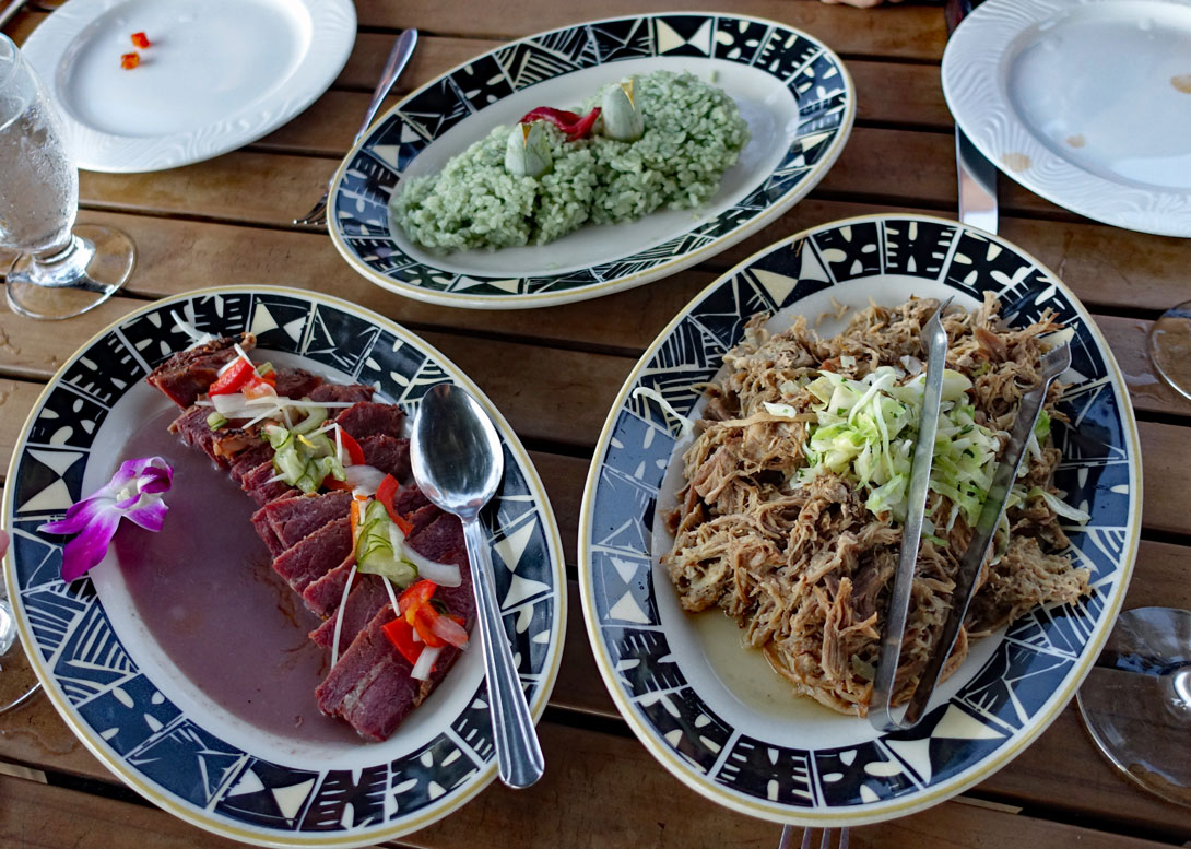 Das ist normalerweise der Höhepunkt der Essenszeremonie, wenn das stundenlang im Erdofen gekochte oder gedämpfte Schweinefleisch aus den Bananenblättern oder Ti-Blättern heraus geholt wird. Wenn es gut gemacht ist, schmeckt es würzig und ist saftig. - Lomilomi Salmon