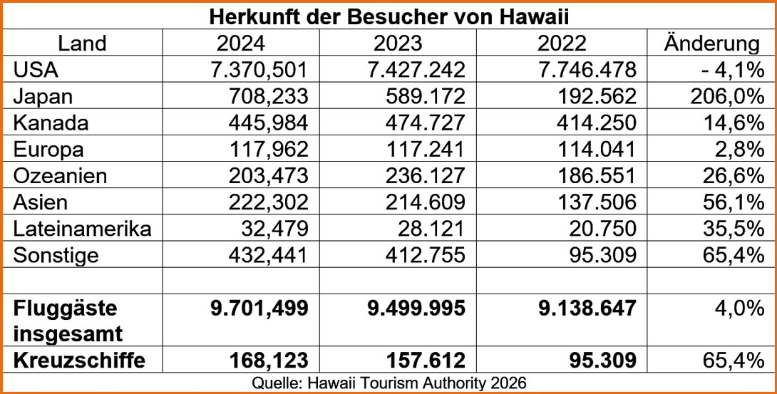 Unter den Besuchern sind natürlich vor allem Amerikaner, aber auch bei den Deutschen ist Hawaii sehr beliebt. Es sind jedoch immer nur knapp 40 000 pro Jahr, die die Inseln besuchen. Das staatliche Touristenbüro hat ein besonderes Programm aufgelegt, mit dem noch mehr Touristen nach Hawaii gelockt werden sollen. Die Besucher lassen jedes Jahr mehr als 1,5 Mrd. Dollar auf den Inseln. Man will die Werbung in Ostasien intensivieren und allein mehr als 2 Millionen Japaner pro Jahr hier begrüßen. Im Augenblick ist es so, dass die Zahl der Touristen aus Korea, China und besonders Australien wieder stark zugenommen hat. Die Zahl der Kreuzfahrtschiffe nimmt wieder zu, die Hawaii anlaufen. 2022 waren nur noch 95,309 Kreuzfahrer hier ausgestiegen, während es im Jahre 2013 noch über 170 000 waren. Während der Pandemie liefen 2021 überhaupt keine Kreuzfahrtschiffe die hawaiianischen Häfen an, im Jahre 2024 stiegen hier wieder 168,123 Kreuzfahrer aus. Für 2025 liegen noch keine aktuellen Zahlen des hawaiianischen Touristenbüros vor.