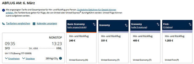 Die Preise variieren natürlich dauernd und hängen auch noch von vielen anderen Faktoren ab. In den meisten Fällen muss mindestens 3 Wochen vorher gebucht oder sofort bezahlt werden. Die Preise haben sich im Jahr 2026 geringfügig erhöht. Schauen Sie deshalb unbedingt auf die aktuellen Webseiten der Fluggesellschaften! Denken Sie auch daran, dass bei einer Buchung in den USA zu den angegebenen Preisen immer noch die Steuer hinzugerechnet werden muss. Außerdem enthalten die Basic-Economy Preise kein Gepäckstück, keine Sitzplatzwahl und keine Möglichkeit einer Buchungsänderung. Bei dem billigsten Flug von San Francisco nach Honolulu am 6.10.2026 mit United, den Sie in der obigen Tabelle sehen, kommt man dann statt auf 505 $ auf United hat eine Übersicht der Tarifbedingungen herausgegeben, die den Unterschied der Tarifklassen sehr deutlich macht: