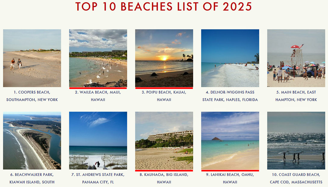 Auf den Seiten zu den einzelnen Inseln habe ich jeweils die schönsten Strände aufgezählt. Es kommt natürlich darauf an, was man dort unternehmen will: schwimmen, schnorcheln, tauchen, surfen, spazieren gehen, joggen oder was erleben... Jeder Strand hat seine besonderen Vorzüge. Weitergehende Informationen finden Sie bei Dr. Beach, das ist der Spitzname von Professor Dr. Stephen Leatherman, der jedes Jahr eine Liste der besten Strände Amerikas veröffentlicht. Fast immer ist ein Strand von Hawaii die Nummer Eins unter den Top Ten Beaches USA. Im Jahre 2024 ist der Duke Kahanamoku Beach der beste Strand der USA gewesen, die Nummer 3 war der Wailea Beach in Maui und die Nr. 5 der Poipu Beach in Kauai. Das bedeutet, dass in der Liste der 10 besten Strände der USA dreimal Hawaii vertreten war. Im Jahre 2025 sind unter den Top Ten Beaches der USA wieder 4 Strände aus Hawaii: